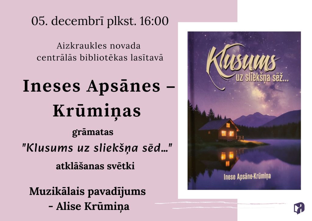 5. decembrī plkst.16.00 esat laipni gaidīti uz Ineses Apsānes – Krūmiņas dzejas grāmatas “Klusums uz sliekšņa sēd…” atklāšanas svētkiem.