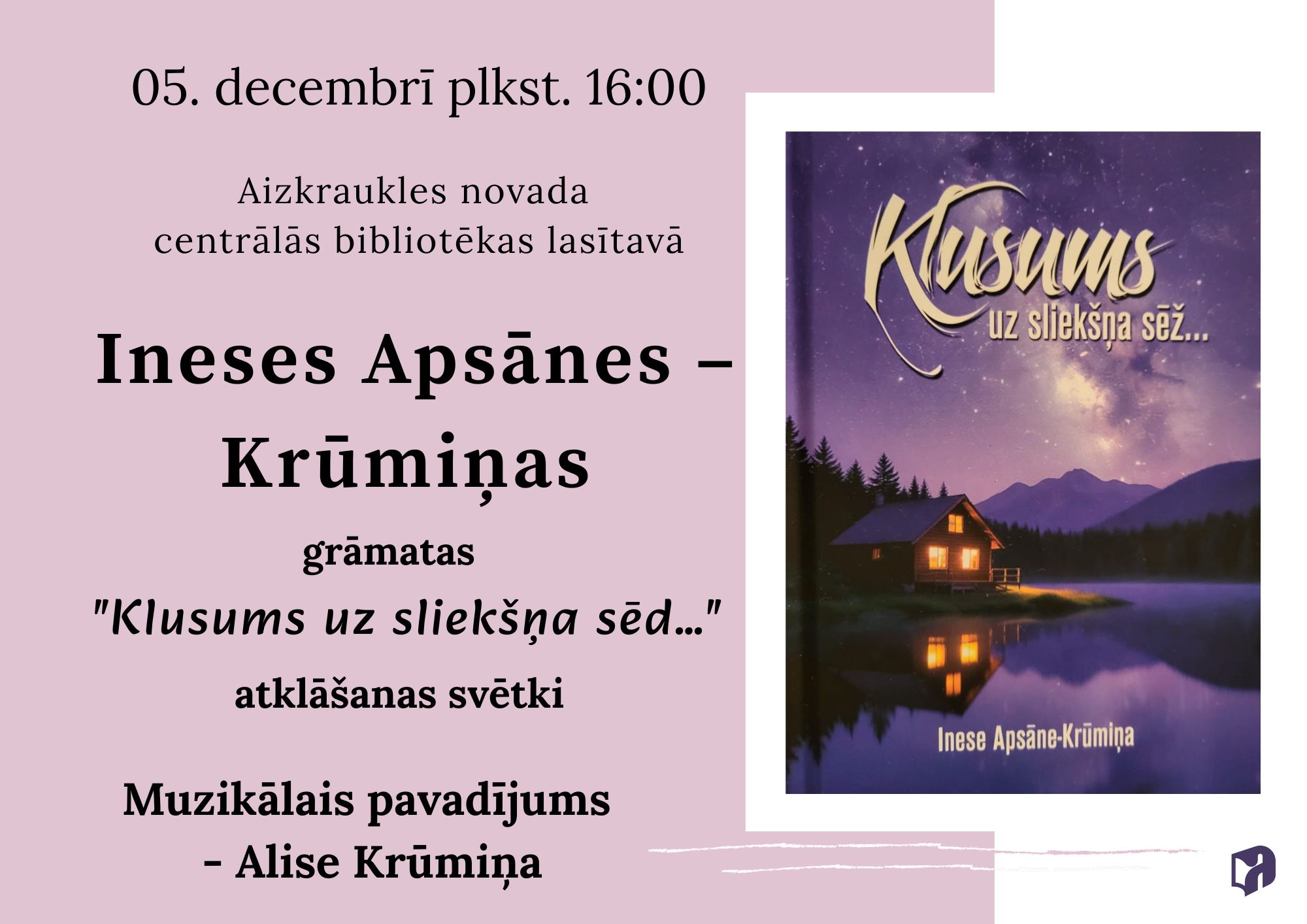 5. decembrī plkst.16.00 esat laipni gaidīti uz Ineses Apsānes – Krūmiņas dzejas grāmatas “Klusums uz sliekšņa sēd…” atklāšanas svētkiem.