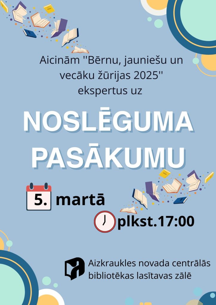 Ar prieku aicinām uz noslēguma pasākumu visus ekspertus, kuri aizrautīgi lasīja “Bērnu, jauniešu un vecāku žūrijas 2025” kolekcijas grāmatas un aizpildīja grāmatu novērtēšanas anketu mūsu bibliotēkā.